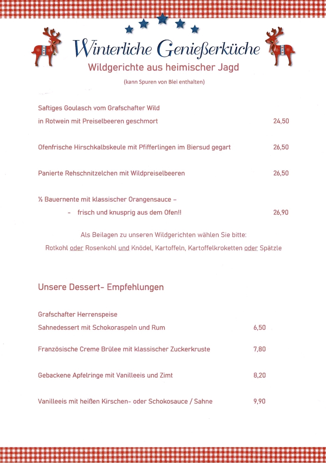 Für nicht rechtzeitig (bis Mittag) abgesagte Reservierungen, Nichterscheinen oder die Abweichung von der ursprünglich reservierten Personenzahl behalten wir uns vor, eine Gebühr von 15,00 € pro nicht besetztem Sitzplatz zu berechnen. Diese Gebühr fällt also auch für die Plätze an, die an Ihrem Tisch aufgrund einer geringeren Gästezahl als reserviert frei bleiben.